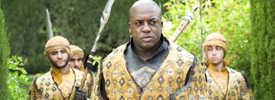 When the head slaver mentions that Queen Daenerys has reopened the fighting pits, Tyrion also plays up Jorah’s reputation as a great fighter and talks them into going to Meereen to sell Jorah there.