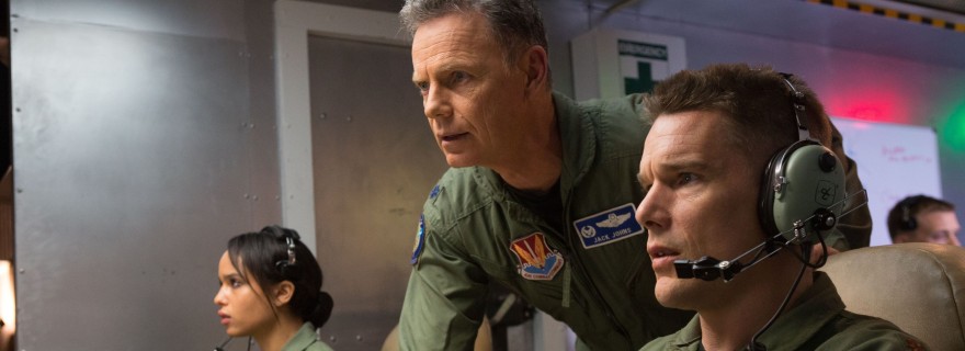 ‘Good Kill’ is essentially Niccol’s comment on the perils of drone warfare, which is certainly a timely topic very much worth exploring. Ethan Hawke stars as a former Top Gun flyboy who now spends his days bombing terrorists on the other side of the world from a computer monitor in the Nevada desert. In theory, it should be a comfortable alternative for someone in his position. He gets to live in a suburban home with his wife (January Jones) and kids, and he never has to risk his life again while serving Uncle Sam. Of course, it’s not quite so easy. Hawke misses the buzz of being in the air. The cold monotony of killing people on a computer screen every day slowly rips apart his psyche until he finds himself drinking away every second that he isn’t killing people remotely. His boss (Bruce Greenwood) doesn’t much care for this new form of warfare either, but views it as a necessary evil. That is, of course, until they start getting secret CIA assignments from the disembodied voice of Peter Coyote that feel much more like war crimes than combat.
