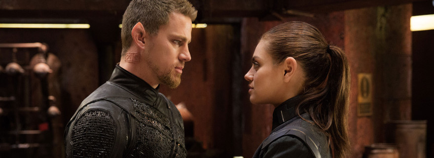 So, plot summary… Yeesh. This will be tough given that the Wachowkis essentially spend every non-action scene struggling to condense all their plot and mythology into bite-sized chunks. I’ll just stick to the basics. Mila Kunis plays Jupiter Jones, an illegal Russian immigrant who cleans toilets to carve out something resembling a life in Chicago. One day, she’s driven to sell her eggs for cash and ends up on an operating table surrounded by aliens planning to kill her. At that moment, Caine (Channing Tatum) bursts through the door and kills all those pesky aliens while flying around the room in a pair of rocket boots. From there, the two make a trip to Sean Bean’s house filled with bees, and we learn that Caine is part wolf, part man, and all hunk, while Jupiter turns out to be the queen of the universe or something along those lines. There are a bunch of amazing action sequences in and around that, and eventually the film goes to the farthest reaches of space, where Jupiter meets the three children she gave birth to in a past life (Tuppence Middleton, Douglas Booth and Eddie Redmayne). Unsurprisingly, they all turn out to be evil in their own personal ways, and Jupiter and Caine have to fight to save the planet Earth.