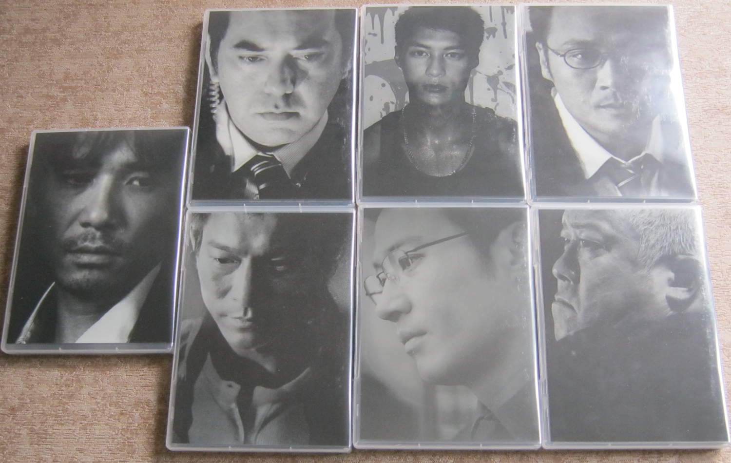 The seven DVD cases all have character photos on both the front and back: