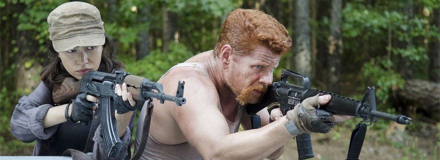 With the others all travelling in the RV, Glenn drives the car with Aaron, Rick and Michonne inside. When Rick discovers a hand-held listening dish in the car, he flips out, thinking Aaron knows more about the group than he’s been letting on. At the same time, Glenn runs the car into a swarm of Walkers, hitting so many of them that the car gets drenched in Walker blood by the time he’s able to come to a stop. Now that the car is stopped, however, Glenn can’t get it started again, and more Walkers are approaching. Then a flare goes off in the distance. Aaron jumps out of the car and takes off into the woods. Rick, Michonne and Glenn run after him.