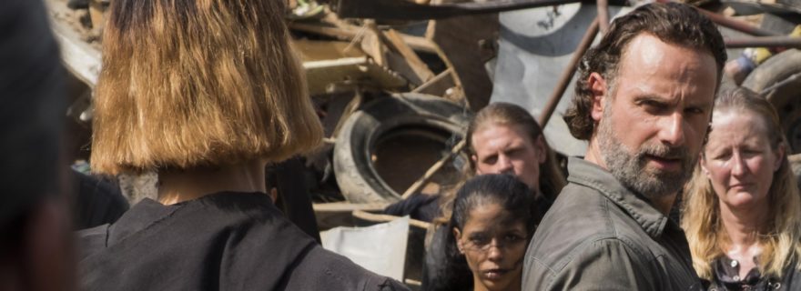 At the end of last week’s episode, Rick, Michonne, Tara, Rosita and Aaron had all been captured by a never-before-seen band of survivors. Rick is unconcerned about this. In fact, he’s happy, because he sees them as a potential alliance against the Saviors.