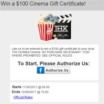 THX is Giving Away Blu-ray Players, Receivers and More Through the Holidays[teaser]You can even get yourself a full THX Certified system by authorizing their Facebook page. [/teaser] What's better than getting a new piece of gear for your home theater? Getting free gear for your home theater. THX is offering it up through their Facebook page and there's plenty to be had. From now until January 13th, THX will be giving away prizes to those that visit, 'like,' and authorize the page. The current prize is a $100 gift certificate to an AMC theater, but future giveaways will include Blu-ray players, receivers, and an integrated system - all THX certified of course. Swing on over to the THX Facebook page and register if you want to get in on the potential swag. Of course, authorizing THX to post to your Facebook wall is a bit of a strange request, so make sure you read up on what you're authorizing before clicking. Source: THX FacebookPosted Thu Dec 1, 2011 at 11:00 AM PST by: -
